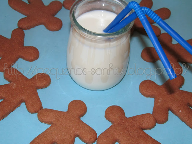 Para fazer estas bolachinhas auxiliei-me de um cortador de homem biscoito [ou boneco de gengibre] que sorrateiramente resgatei da mala de plasticina das meninas.