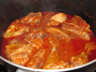 Fazer um refogado com a cebola e o alho picados, a cenoura ralada e o azeite. Juntar o frango desfiado, o vinho e o molho de soja [este último dispensei] e temperar a gosto. Eu juntei ainda umas salsichas em rodelas, uma vez que o frango de que dispunha não chegava às 350 g necessárias.